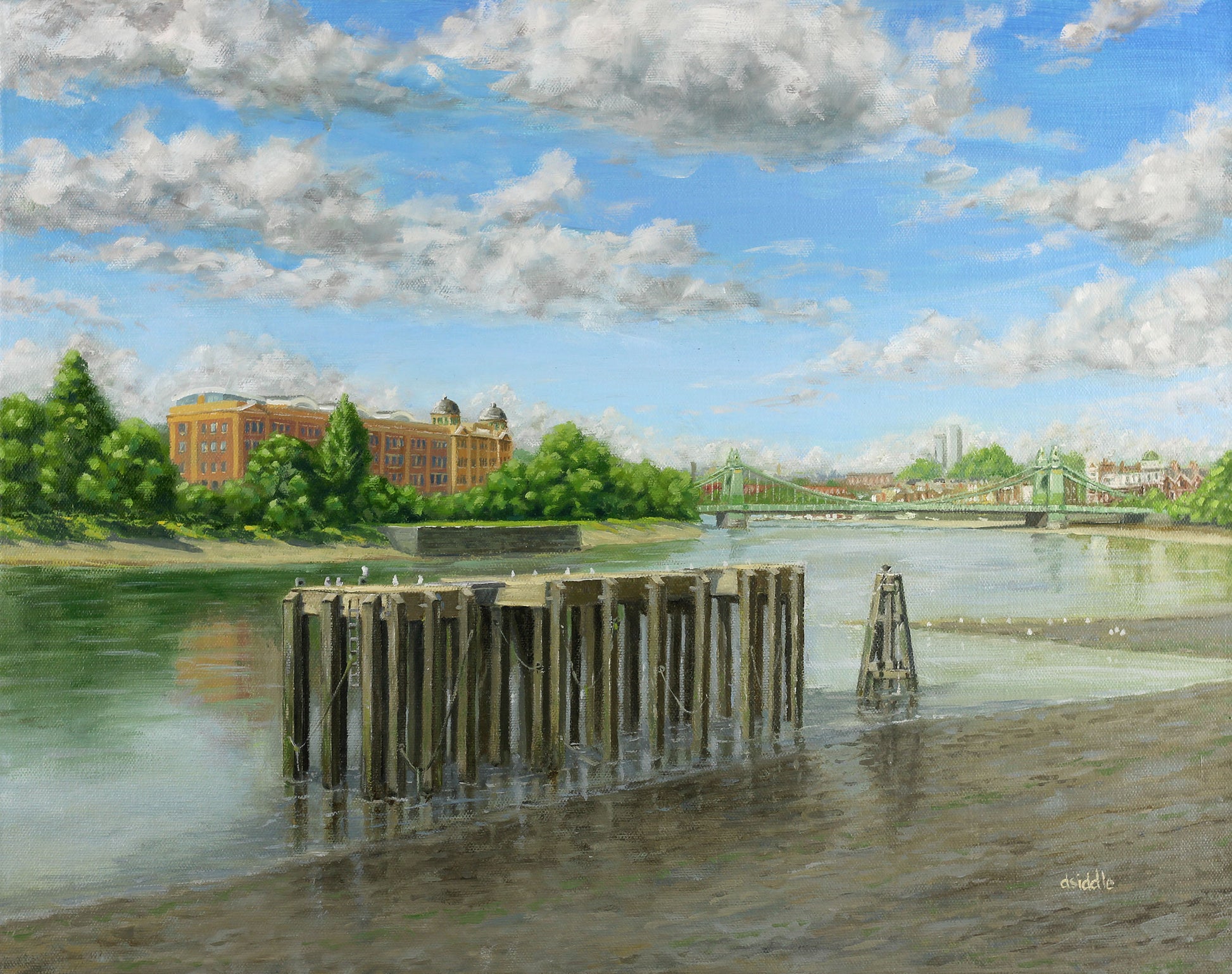 View looking West from the Thames Path on the north side of the river. The image was captured in the late summer of 2023, and painted in 2024 for the Barnes OSO art fair 2024.